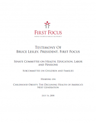 On July 16, 2008, First Focus President Bruce Lesley testified before the Senate Committee on Health, Education, Labor, & Pensions’ Subcommittee on Children & Families about the childhood obesity epidemic and its role in the rapidly declining health of our next generation.