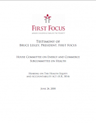 On June 24, 2008, First Focus President Bruce Lesley testified before the House Committee on Energy and Commerce's Subcommittee on Health to discuss the Health Equity and Accountability Act (H.R. 3014). The Act aims to reducing health disparities by improving access to health care, research, and education on the diseases and illnesses that are having a disproportionate impact on minorities.