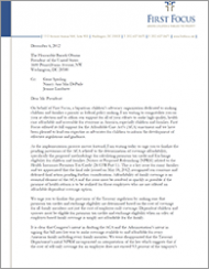 First Focus sent a letter to President Obama, urging the Administration to ensure that final U.S. Treasury Department Affordable Care Act (ACA) regulations make health coverage affordable for families. The ACA offers tax credits to make private, employer-sponsored health insurance more affordable for working families. The law bases eligibility determinations on a comparison of the cost of the insurance and the family’s income. But the Treasury Department’s first draft of regulations implementing that provision of the ACA base that assessment on the cost of insuring the employee alone, instead of the cost of family coverage. While individual-only employer-sponsored health insurance costs average around $5,400 a year, annual costs for family coverage average $15,000 – nearly triple. If not clarified by the Administration, this interpretation would likely leave hundreds of thousands of children as well as their non-employee parents ineligible for tax credits or subsidized coverage in the health insurance Exchanges.