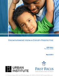 A new report for First Focus shows that one in six children lives with a parent who is unemployed or underemployed. Unemployment from a Child's Perspective, by Julia Isaacs of the Urban Institute, confirms that though recent years have shown appreciable improvement, recession-driven job losses continue to have widespread impact for kids. The analysis also shows that three federal initiatives for families facing tough economic times are largely failing to reach children affected by the employment downturn.